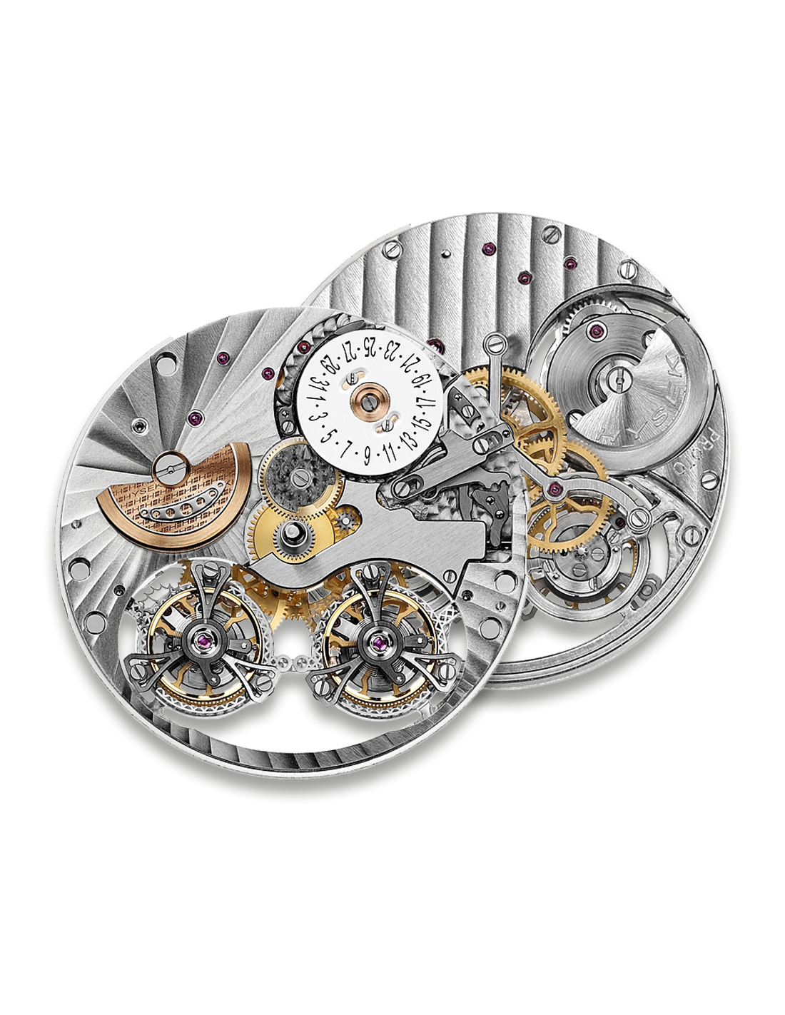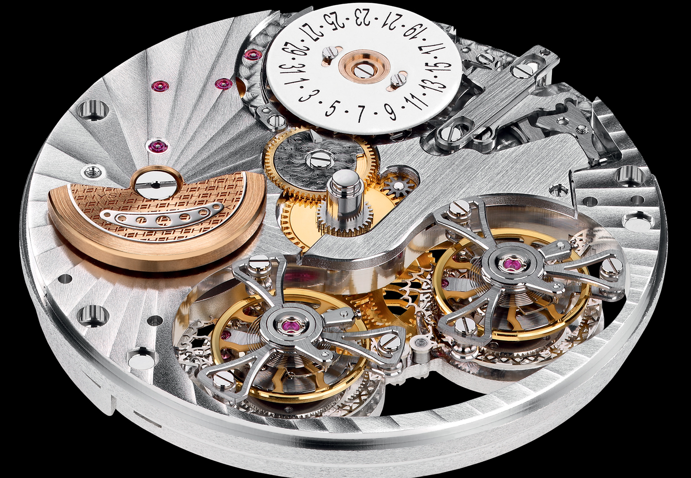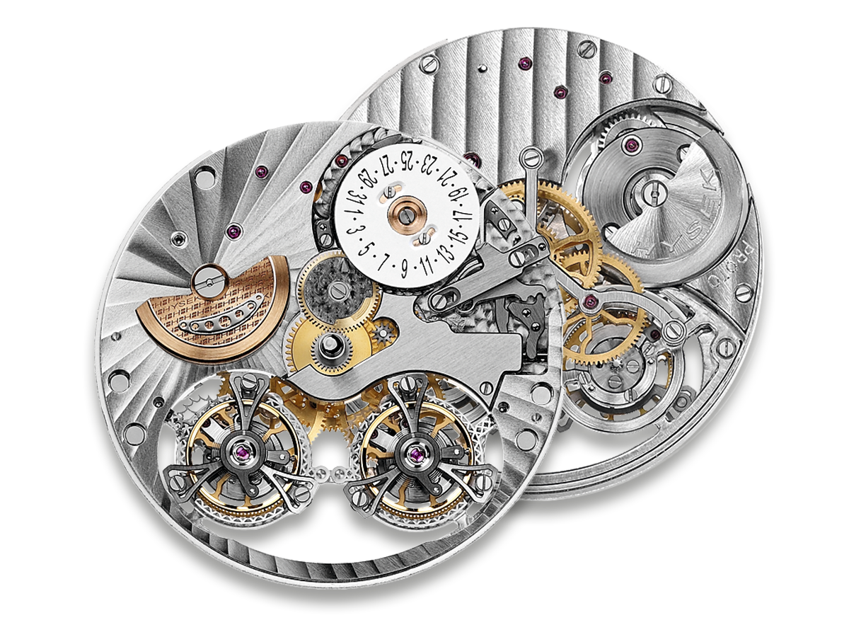 Both tourbillons, independent one from the other, are coupled by means of a differential gearing mechanism. The watch’s rate is thus the average of the rate of both tourbillons, which means that it is twice as precise as a traditional movement