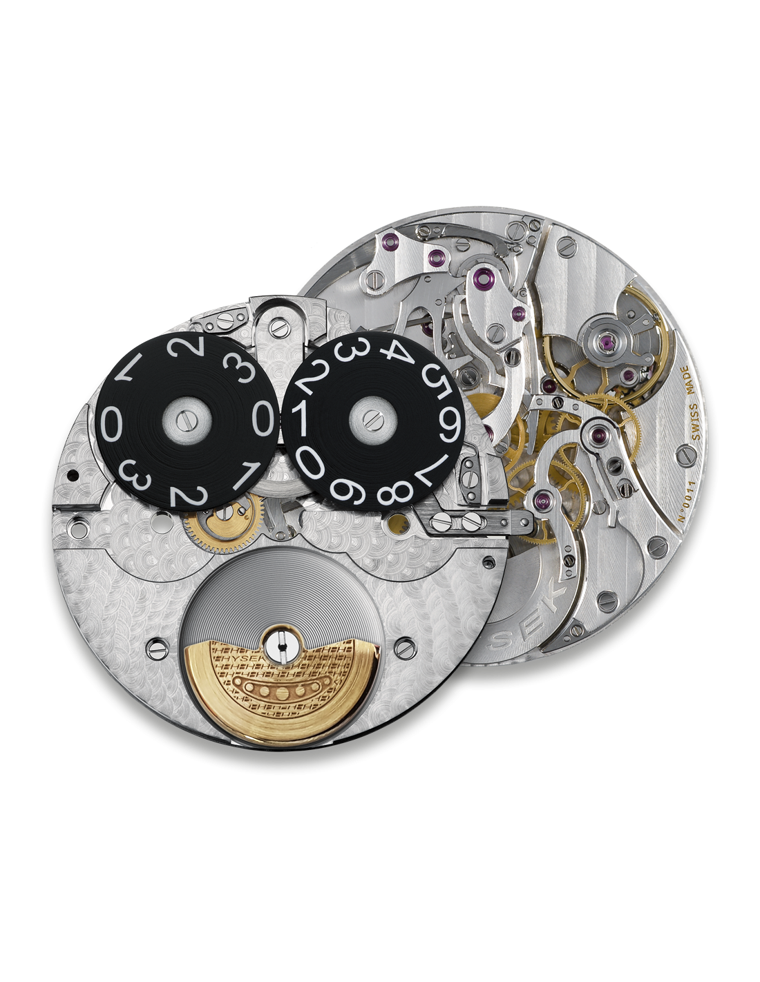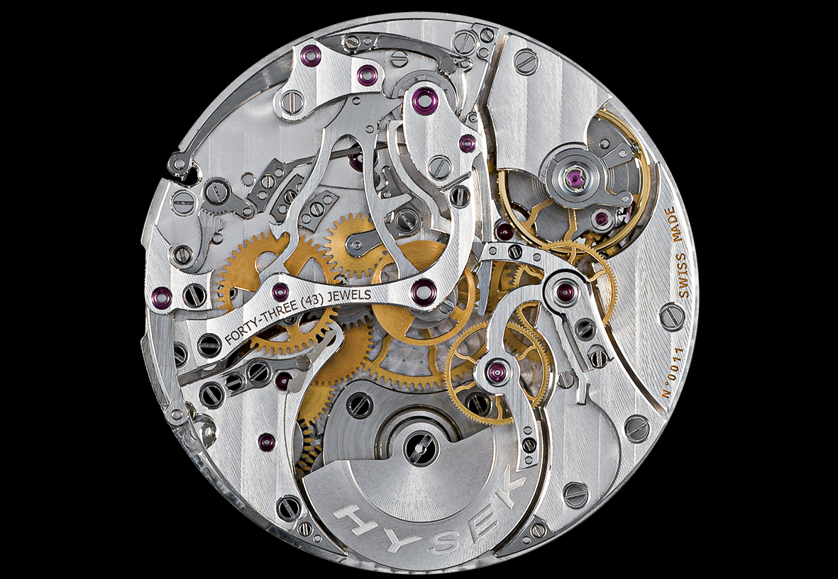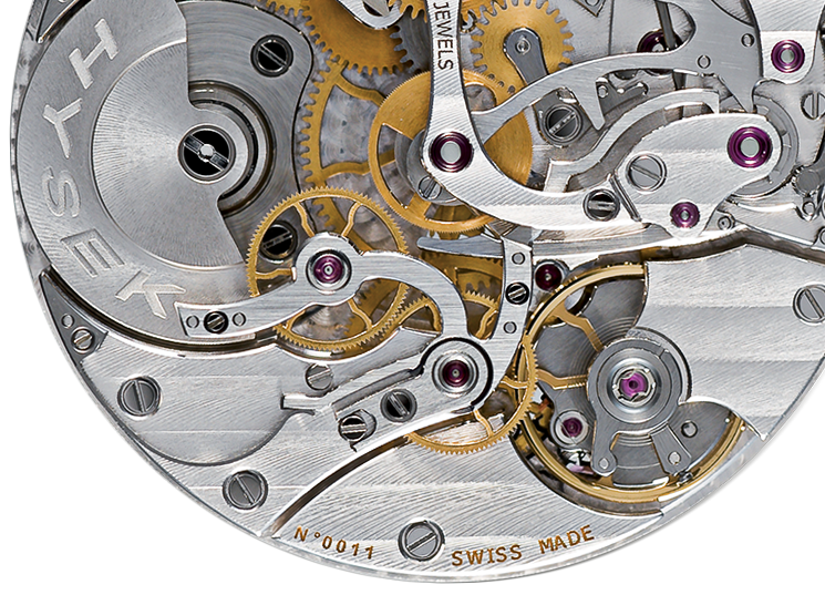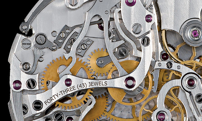 Its movement, developed and assembled within the manufacture has been subject to an extensive engineering work to sensibly improve its functionalities, set in action by pieces such as classical column wheel, levers and springs bevelled by hand. The automatic winding of the heart is thus not made by the oscillating classical turning point mass, but by a double micro-rotor integrated into the movement structure itself, visible on the back of the watch as well as on the dial side.