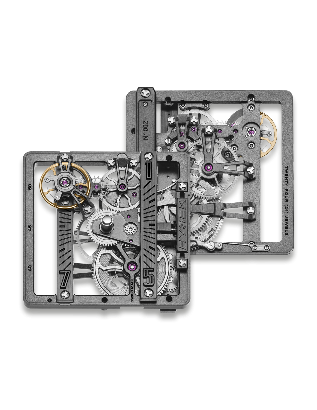 The design of each wheel required for this exceptional movement to operate features three double spokes, providing perfect technical and aesthetic balance – as well as being a recurring style signature for Hysek.