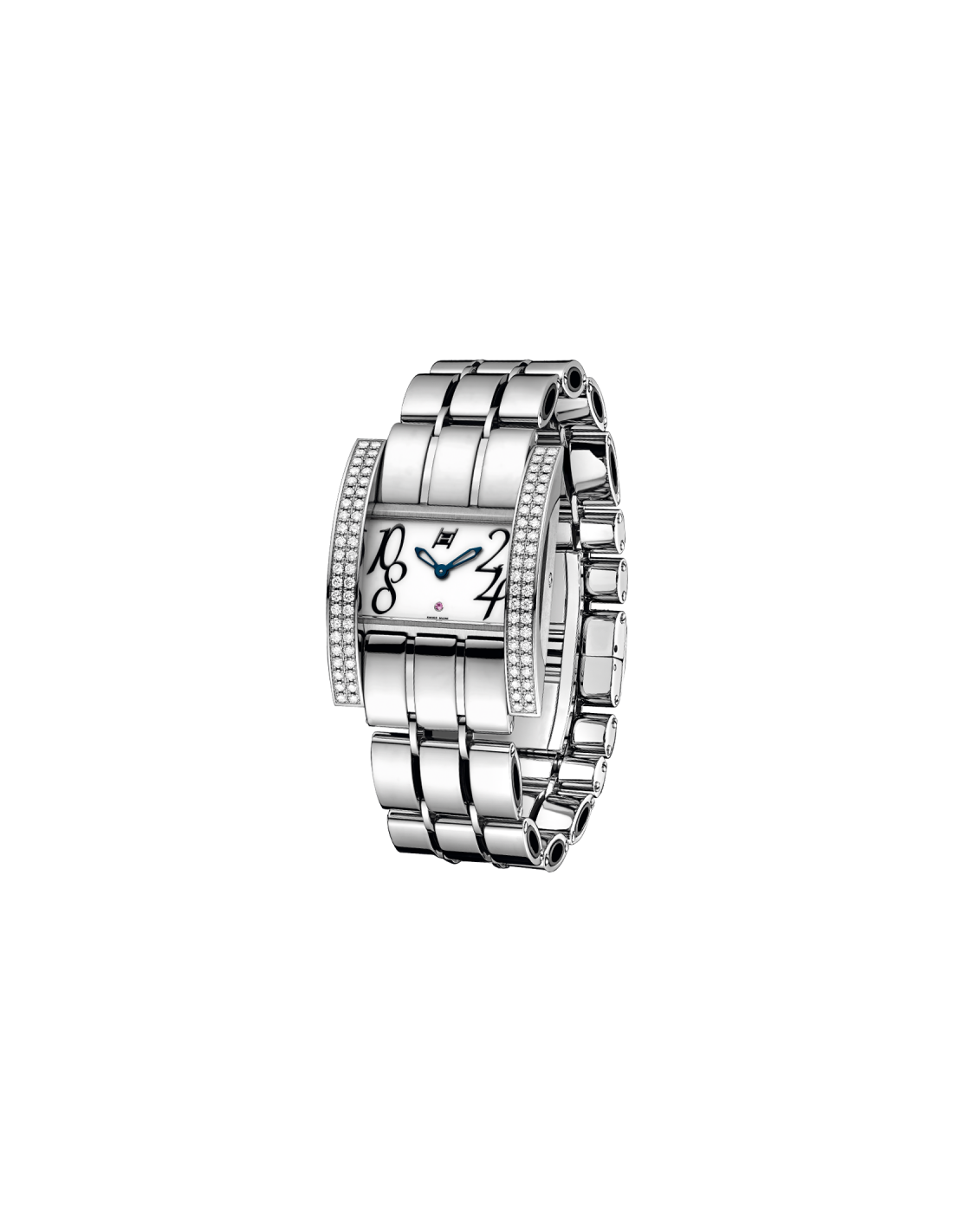 Offering a timeless elegance, this timepiece is a true homage to feminity. The combination of the unique suspended and curved case, extended by a strap perfectly fitting the wrist provides a pure and avant-garde character.