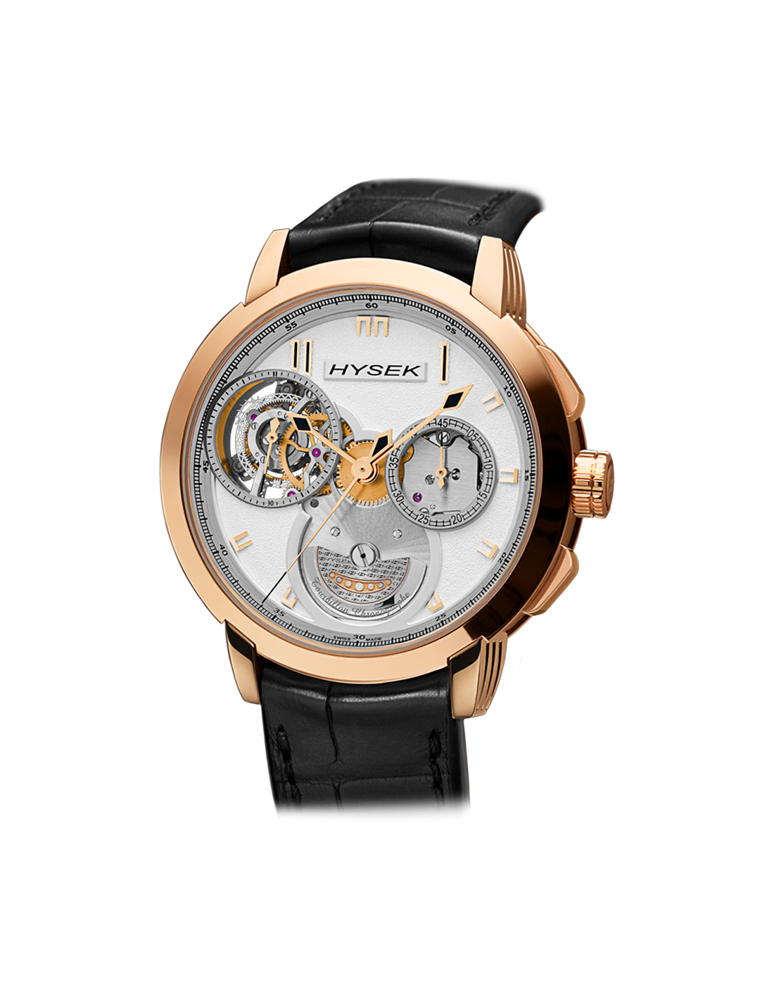 The IO line is intended for a more classical customer, sensitive to the very distinctive design which embodies the HYSEK brand. This aesthetically perfect timepiece with rounded curves is available in different version as Jumping Hours, Moon phase, Power Reserve…